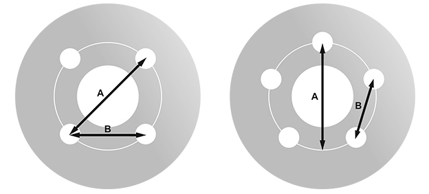 Allaolevan taulukon avulla voit mitata auton pulttikehän eli PCD:n(pitch circle diameter) halkaisijan. Katso soveltuvuustaulukosta oman auton pulttijako ja ET-luku.